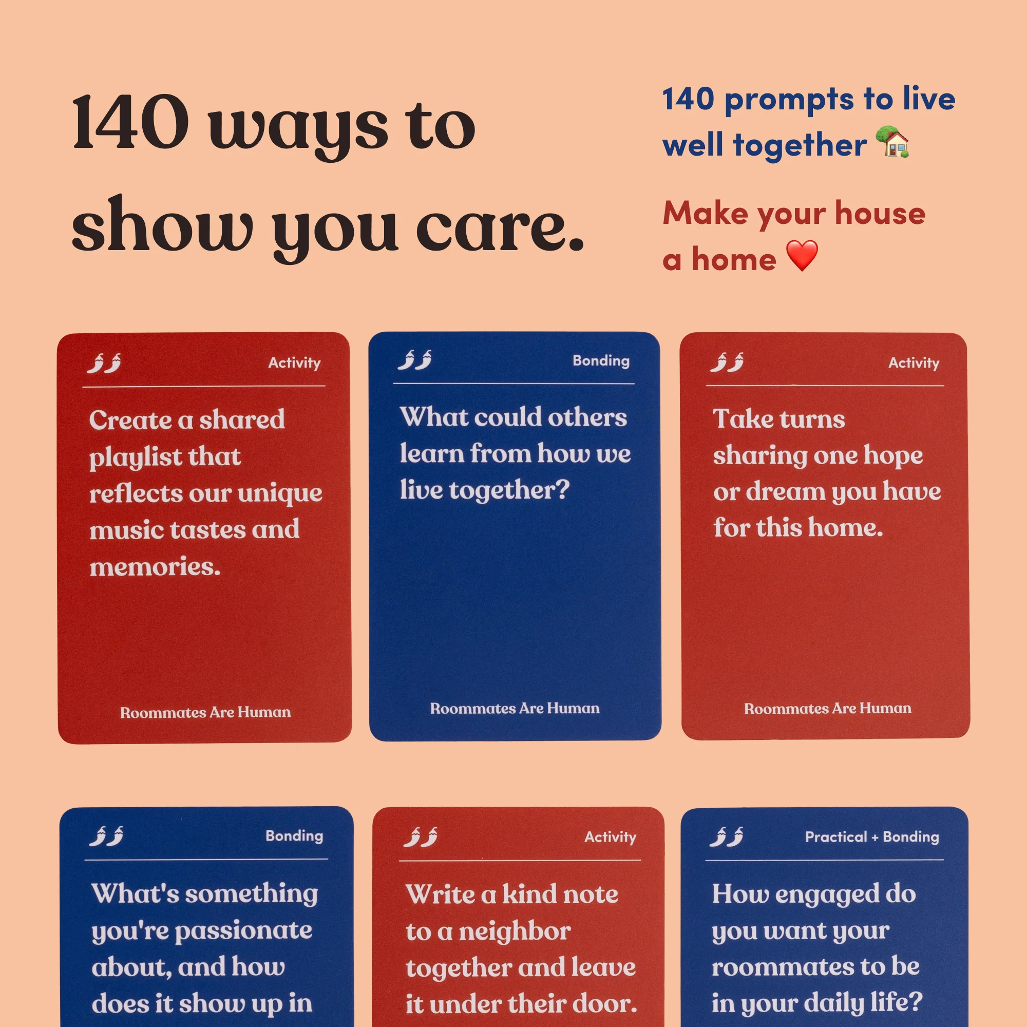 A game for discovering how to live well together. Deepen your relationship(s) with the current and future people you live with through practical + bonding questions and shared activities.